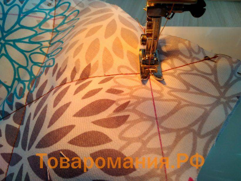 Соединить верхнюю и среднюю части друг к другу и сшивать, загибая углы квадрата, чтобы изделие приобретало форму круга.