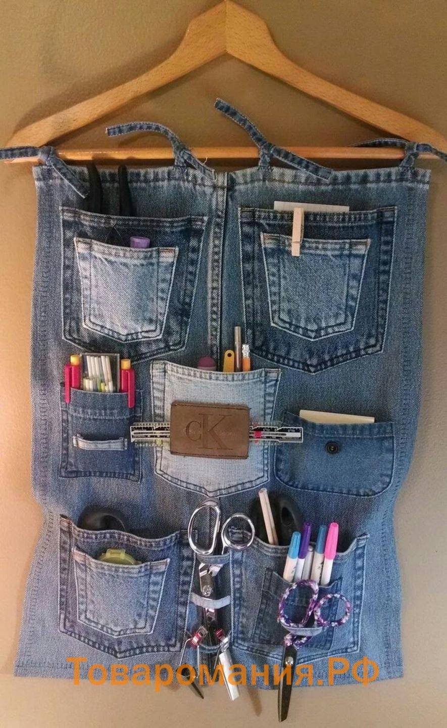 Такое приспособление отличается повышенной надежностью и простотой, ведь изготавливается из плотной и крепкой джинсовой ткани. Для этого можно специально купить отрез, но куда более практично будет изготовить изделие из старых штанов. Использовать при этом можно не только задние карманы, но и шлевки, которые послужат фиксационными элементами для круглых предметов.