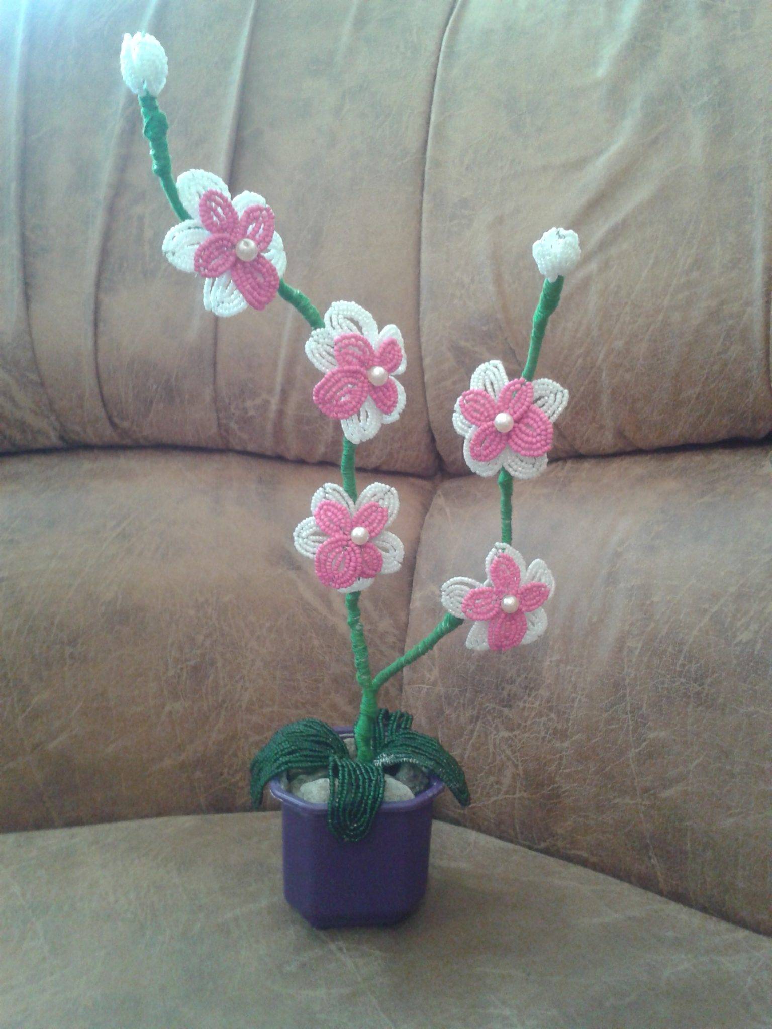 Для начала нужно было выбрать цвет, вид и сорт из сотен разновидностей. И вот наконец я определилась, мне очень понравилась веточка розовой орхидеи с круглыми лепестками, но такого бисера у меня не нашлось, а было много нежно оранжевого и тогда мне пришлось комбинировать розовую и оранжевую орхидею, чтобы сплести что-то альтернативное.