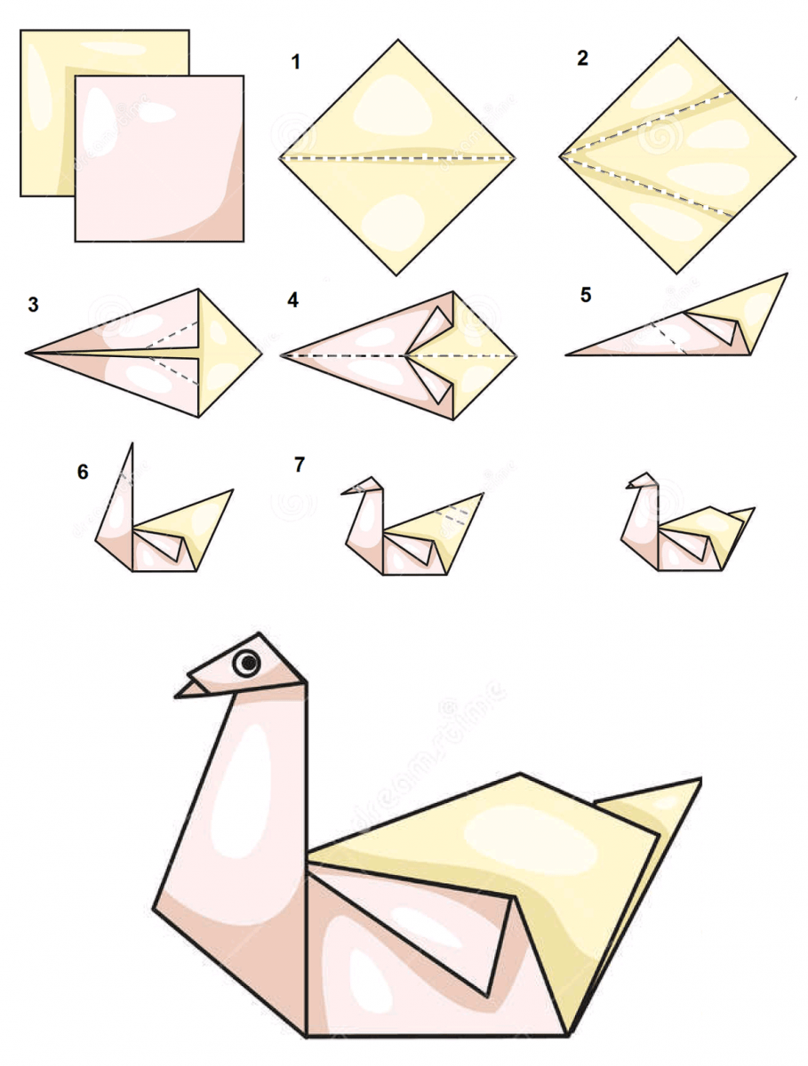 - Края, которые остались нужно загнуть к центру. Длинные части ромба нужно отогнуть поперек к центру. Это будет шея и хвост. На одном длинном угле надо загнуть треугольник, который станет головой.