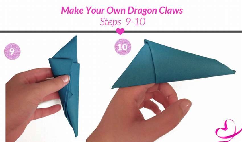 Нет лучшего способа оценить мистические существа, чем стать похожим на них! Сделайте на одну руку вот такие когти дракона из бумаги для игры или домашней вечеринки и пусть гости трепещут от страха. Для поделки вам нужно приготовить по одному листу бумаги для каждого пальца. Имейте в виду, что чем тоньше бумага, тем легче будет сложить! Возьмите верхний правый угол и сложите его так, чтобы верхний край совпадал с левой стороной вашего листа бумаги. Последовательность, как сделать коготь из бумаги, показана ниже на фото.