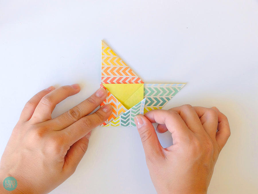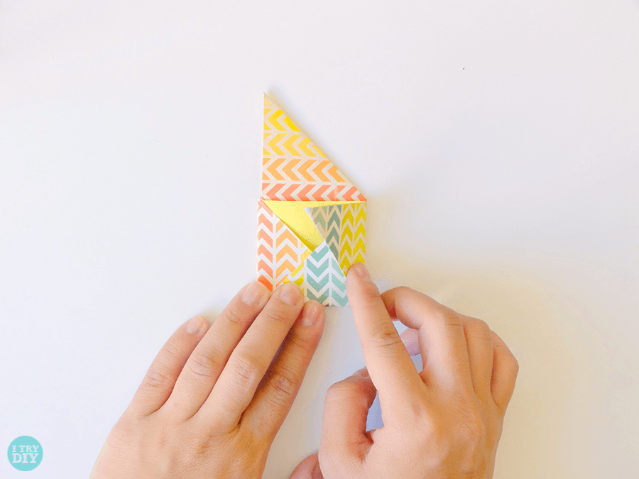 Ромб разворачивается горизонтально, правая сторона заворачивается до тех пор, пока верхний край не выровняется с нижней частью. Верх сгибаемого правого участка заправляется под нижний сгиб.