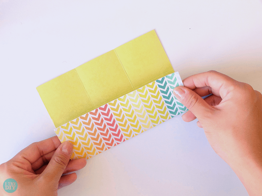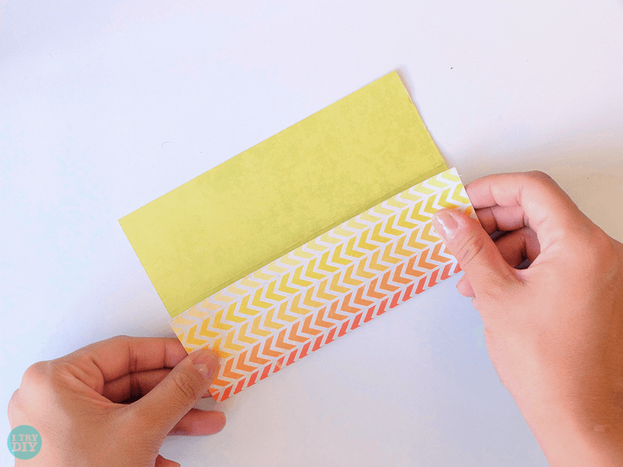 Верхнюю сторону согните наружу пополам к нижней стороне. Её же подверните наверх к середине. Эту же часть немного загните наверх (примерно один сантиметр), чтобы получить кармашек. Это будет поясом для конверта.