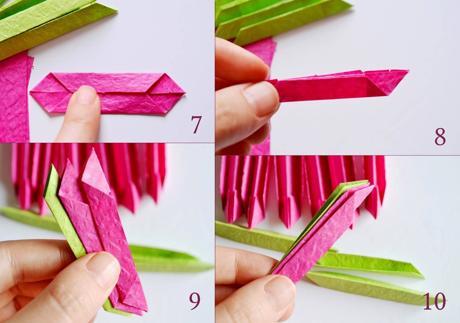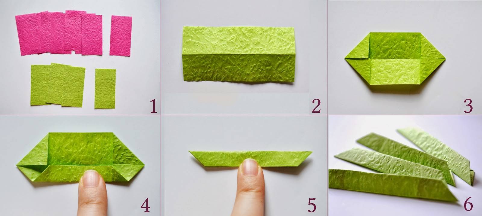 - Для этого просто выверните зеленые модули по направлению вверх. Все движения совершайте мягко и аккуратно, иначе бумага порвется, или цветок получится несимметричным.