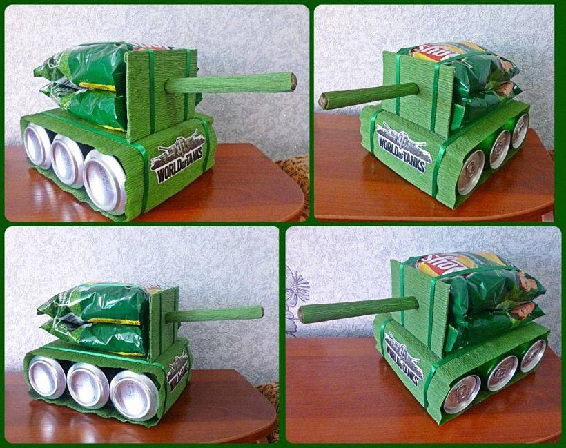 Детки также смогут смастерить самые простые версии танка, используя бумагу и подручные средства. Такой милый подарок папам к 23 февраля или на 9 мая можно сделать из бумаги, втулок от туалетной бумаги при помощи зеленой гуаши, ножниц, степлера, карандаша, трубочки коктейльной, линейки, двух спичечных коробок, клея-карандаша, ПВА, коробки из-под чая.