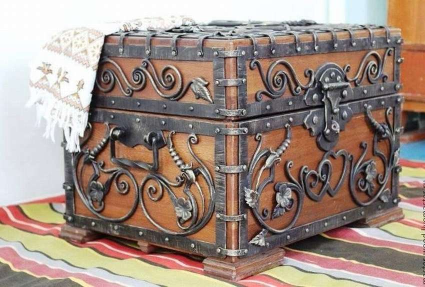 Сделать сундук красивым и вернуть ему вторую жизнь также можно с помощью кованых элементов, такой сундук впишется в любой ваш интерьер комнаты.