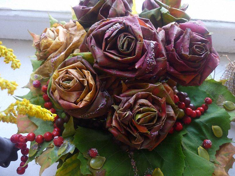 Если простой букет кажется банальным, то можно из листвы скрутить имитацию роз. Для понимания процесса не потребуется пошаговая инструкция. Задача предельно проста.