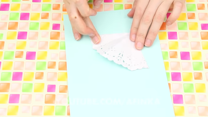 - лист белого картона по периметру оклеивают тонким кружевом;