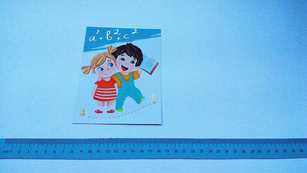 Вырежьте интересную вам картинку и добавьте любые канцелярские мотивы, например, линейку, которая будет использована в качестве бордюра.
