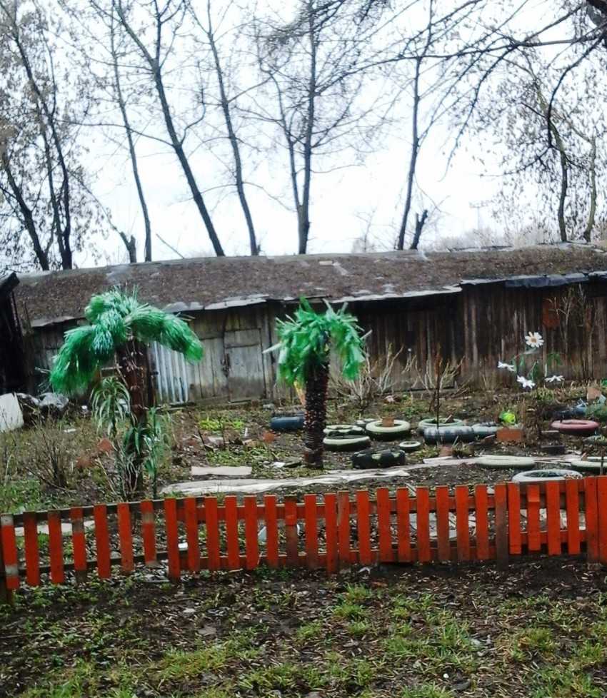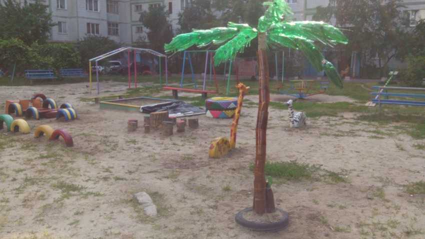 Искусственная пальма приносит большой эффект, если она расположена возле детской площадки. Это беспроигрышный вариант, дети будут радоваться такому творению.