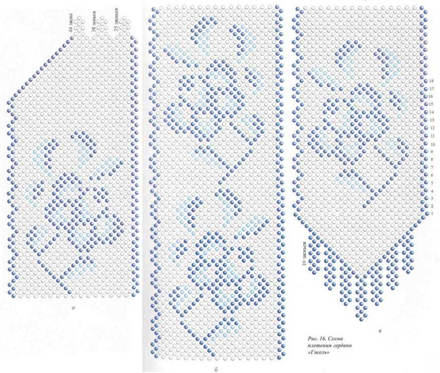 Плетение совершенно простое, так как изделие будет состоять из двух похожих между собой лент. Первую следует делать согласно схемы, затем продолжайте работать на основании этого же рисунка. Внизу нужно будет изготовить семь подвесок состоящих из десяти звеньев в технике креста. Когда будет завершено плетение первой ленточки, приступайте к созданию второй. Положите их параллельно друг другу так, чтобы орнамент находился по симметрии. Вверху соедините крестики в трех частях, а внизу соедините точно также. Только для этого используйте бисер с первой по восемнадцатую первой ленточки, а с противоположной стороны стекляшки также с первой по восемнадцатую, но с другой стороны. Вот и все, стильный, модный, а главное эксклюзивный гердан полностью сплетен.