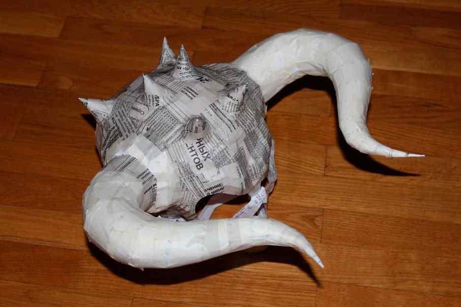 Теперь рвём бумагу и обклеиваем заготовку. Первый слой делаем водным (приклеиваем их с помощью воды), чтобы потом можно было без проблем отделить фигурку из папье-маше от слепка. После этого проклеиваем слои, используя клейстер.