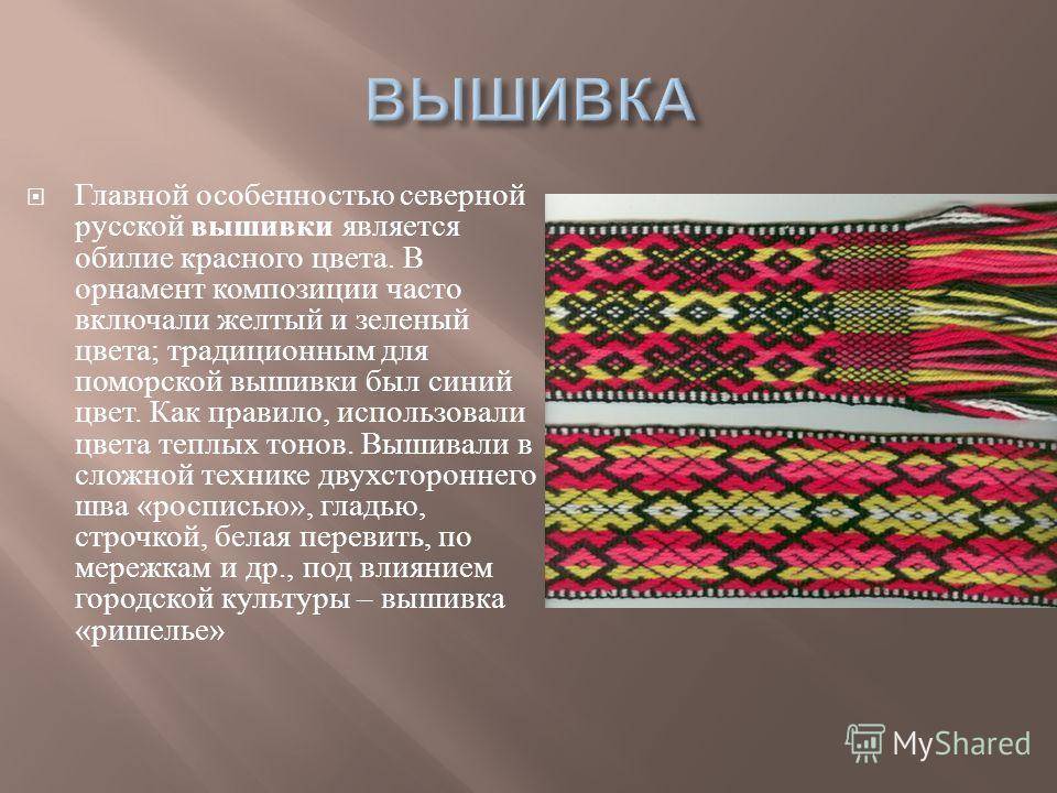 Главной особенностью северной русской вышивки является обилие красного цвета. В орнамент композиции часто включали желтый и зеленый цвета ; традиционным для поморской вышивки был синий цвет. Как правило, использовали цвета теплых тонов. Вышивали в сложной технике двухстороннего шва « росписью », гладью, строчкой, белая перевить, по мережкам и др., под влиянием городской культуры – вышивка « ришелье »