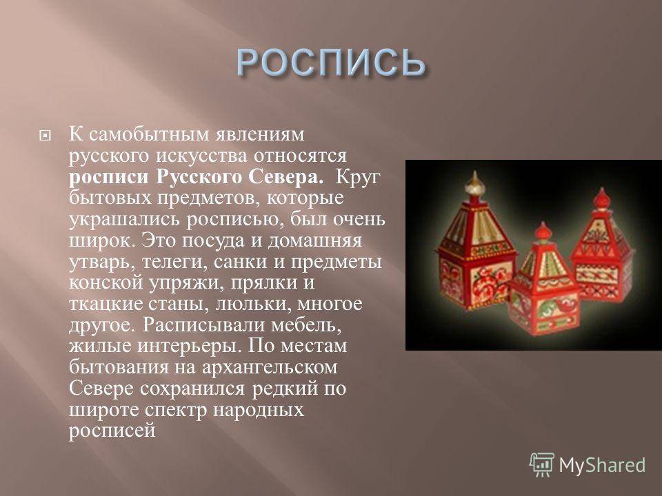 К самобытным явлениям русского искусства относятся росписи Русского Севера. Круг бытовых предметов, которые украшались росписью, был очень широк. Это посуда и домашняя утварь, телеги, санки и предметы конской упряжи, прялки и ткацкие станы, люльки, многое другое. Расписывали мебель, жилые интерьеры. По местам бытования на архангельском Севере сохранился редкий по широте спектр народных росписей