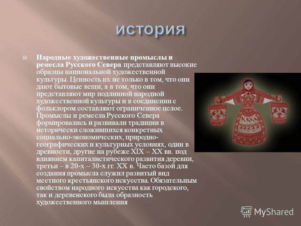 Презентация на тему: ” Народные художественные промыслы и ремесла Русского Севера представляют высокие образцы национальной художественной культуры. Ценность их не только в.” — Транскрипт: