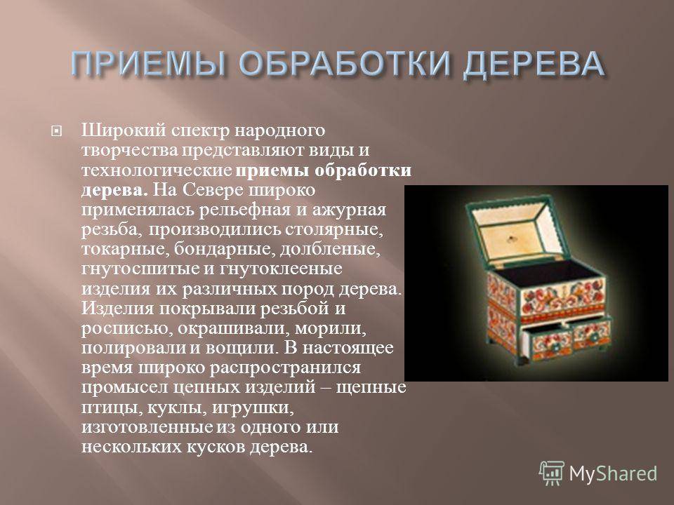Широкий спектр народного творчества представляют виды и технологические приемы обработки дерева. На Севере широко применялась рельефная и ажурная резьба, производились столярные, токарные, бондарные, долбленые, гнутосшитые и гнутоклееные изделия их различных пород дерева. Изделия покрывали резьбой и росписью, окрашивали, морили, полировали и вощили. В настоящее время широко распространился промысел цепных изделий – щепные птицы, куклы, игрушки, изготовленные из одного или нескольких кусков дерева.