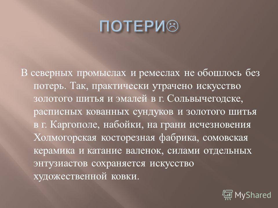 В северных промыслах и ремеслах не обошлось без потерь. Так, практически утрачено искусство золотого шитья и эмалей в г. C ольвычегодске, расписных кованных сундуков и золотого шитья в г. Каргополе, набойки, на грани исчезновения Холмогорская косторезная фабрика, сомовская керамика и катание валенок, силами отдельных энтузиастов сохраняется искусство художественной ковки.