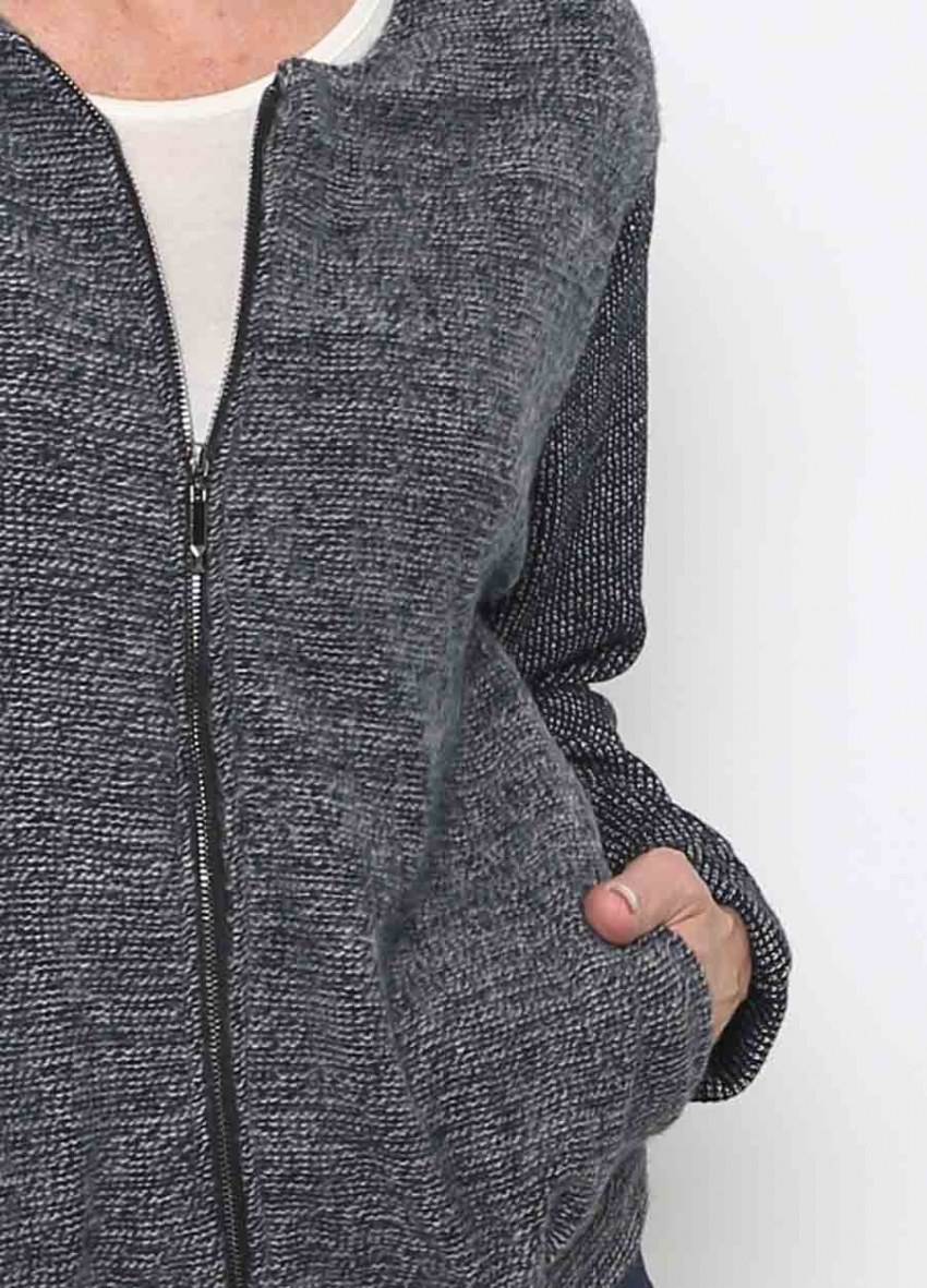- Интересный вязаный жакет на молнии сочетает в себе ажурный узор, связанный крючком и плотные планки, выполненные на спицах.