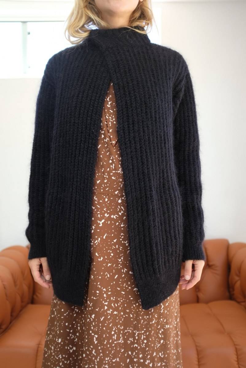 Гармонично созданный образ модели с вязаным жакетом станет вполне уместен в стенах современного офиса.