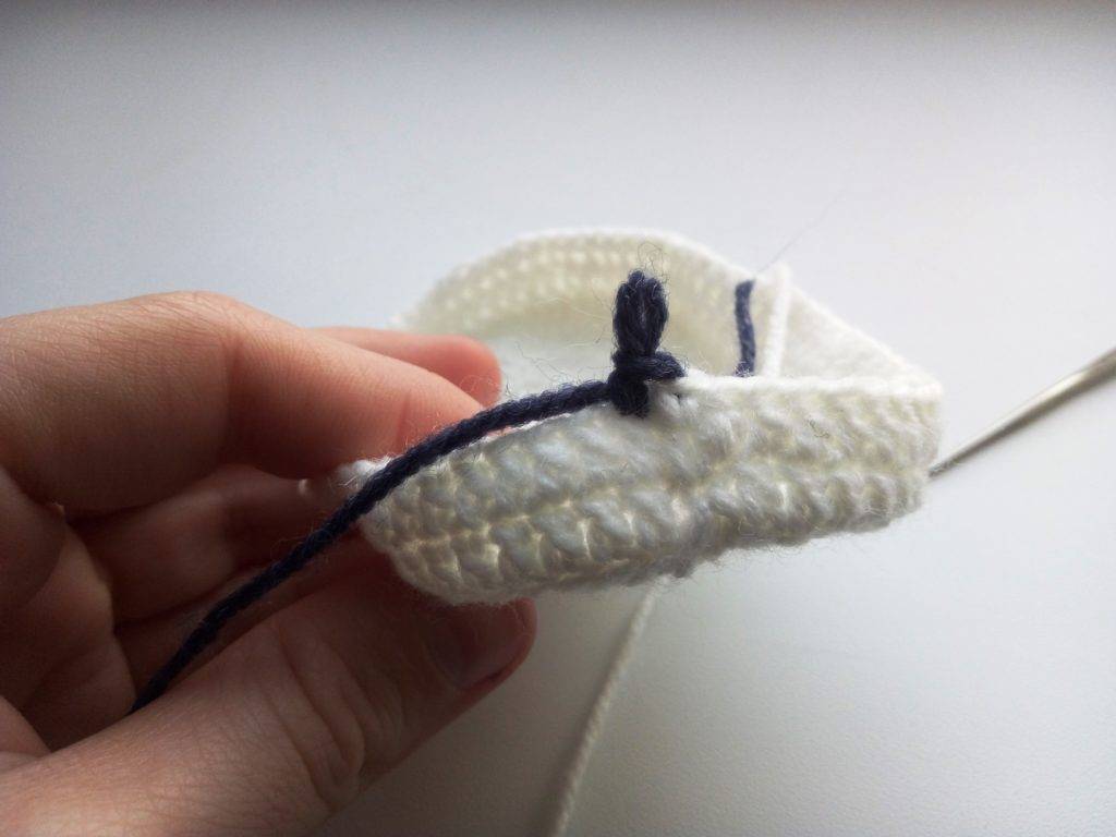 Из ниток белого цвета крючком вяжем два шнурка из воздушных петель длиной около 140 см. На задней части носка будущих кед и вдоль планок с помощью крючка прокладываем декоративные дорожки нитками белого цвета.