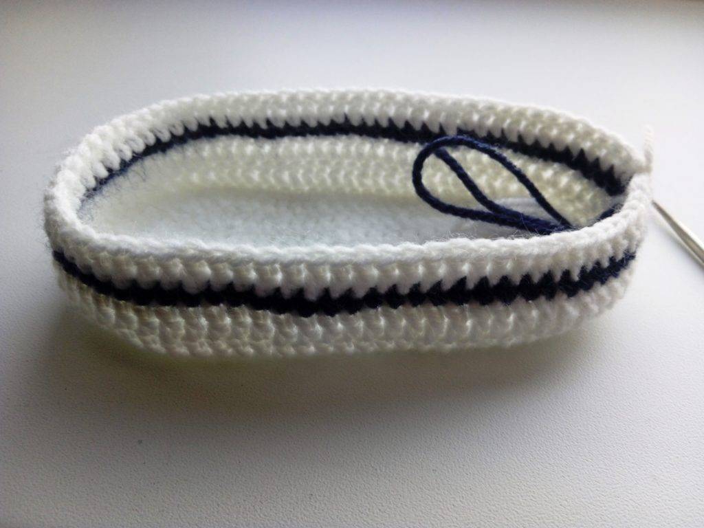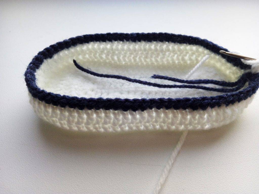 При желании его можно сделать и немного шире. Продолжить вязание без закрепления боковых сторон пинеток другой пряжей до высоты бортиков. Затем сделать небольшое прибавления и провязать ряд белой пряжей, далее ряд столбиками с одним накидом, снова ряд белой пряжей и окончить столбиками без накида голубым цветом.