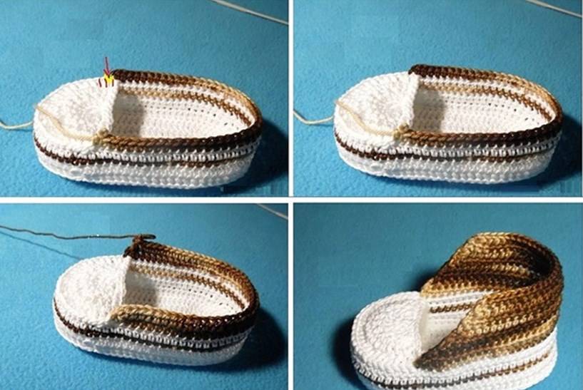 - Следующий этап состоит из создания боковины. Для этого достаточно двух рядов одним цветом. Для работы подойдёт несколько полосок со сменой пряжи. Боковая часть должна закрывать ножку, но не быть выше, чтобы пинетка не деформировалась.