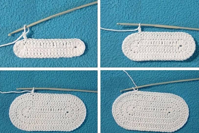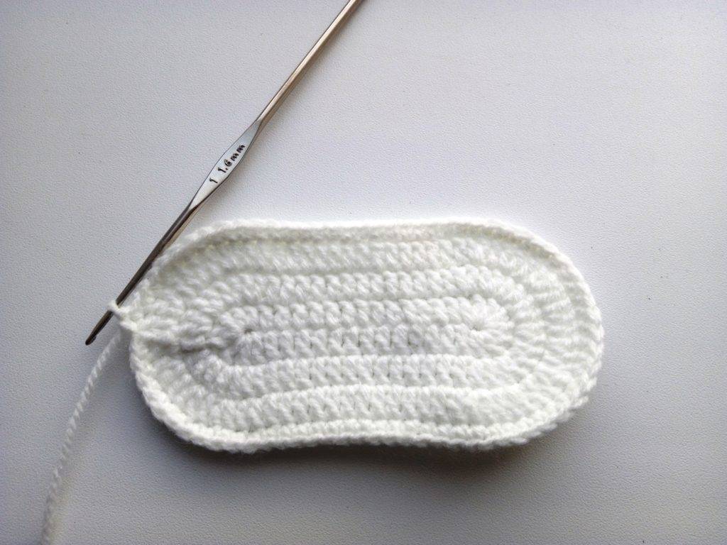 - Набирается цепочка из 10 воздушных петель и круговыми рядами вывязывается овальная подошва, как на картинке. Для вязания этой детали лучше использовать темную пряжу.