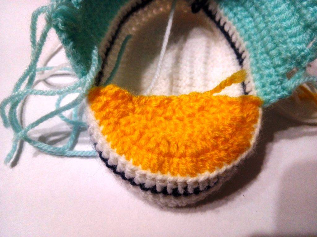 - На третьем этапе количество петель делиться пополам и пряжей другого цвета выполняется носовая часть. Столбики с/н провязываются за заднюю стенку петельки, и со второго ряда убавляются путем сокращения боковых петель.