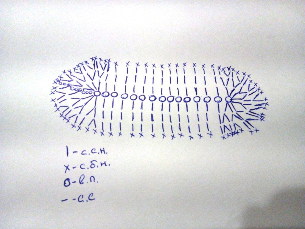 1 р.: 1 с. без н. во 2-ю п. от крючка, по 1 с. без н. в следующие 8 п., далее по 1 с. без н. в следующие 9 п. Вяжем 7 с. с н. в последнюю п. и переходим на противоположную сторону цепочки из в. п. Вяжем симметрично 9 с. с н., 9 с. без н. и 6 с. с н. в 1-ю п. цепи, сс. для соединения ряда в круг.
