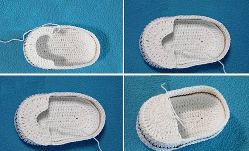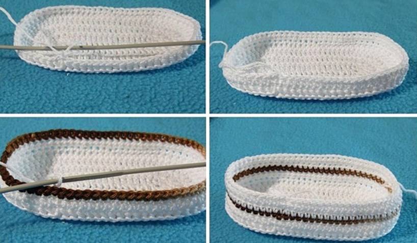 - Боковина подошвы по всему периметру провязывается в несколько рядов с помощью чередования лицевых и изнаночных петель. В результате должна получиться лицевая гладь, именно эта техника хорошо придаёт форму и позволяет выработать изделие объёмным.