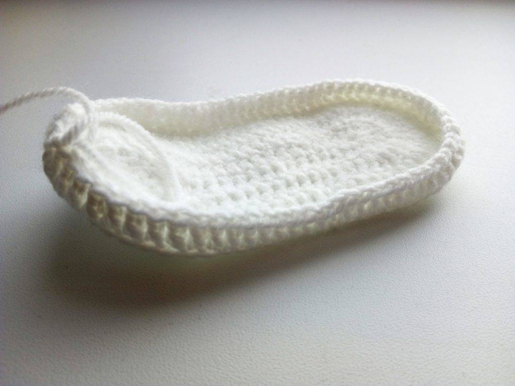 Поворачиваю пинетку, вяжу обратно ряд с.б.н. Отверстия для шнурков делаю в конце и начале ряда с.с.н по схеме. Для пинеток на малышей постарше делаем бортики выше, не 7 рядов, как показано у меня, а 9. Лишние ниточки отрезаю, закрепляю и прячу, ввязывая крючком в бортик.