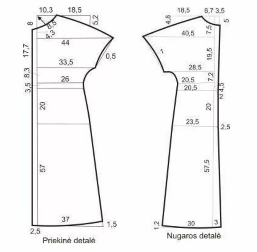 ВНИМАНИЕ! Выкройка дана без ПРИПУСКОВ на швы! (При раскрое вы их должны прибавить). Рекомендованные припуски: для стачных швов (боковые, плечевые, рельефные и т.д.) прибавить по 1,5 см, для обтачных швов (горловина) по 0,7 см, а на подгибку низа дать 2 — 4 см, в зависимости от вида ткани