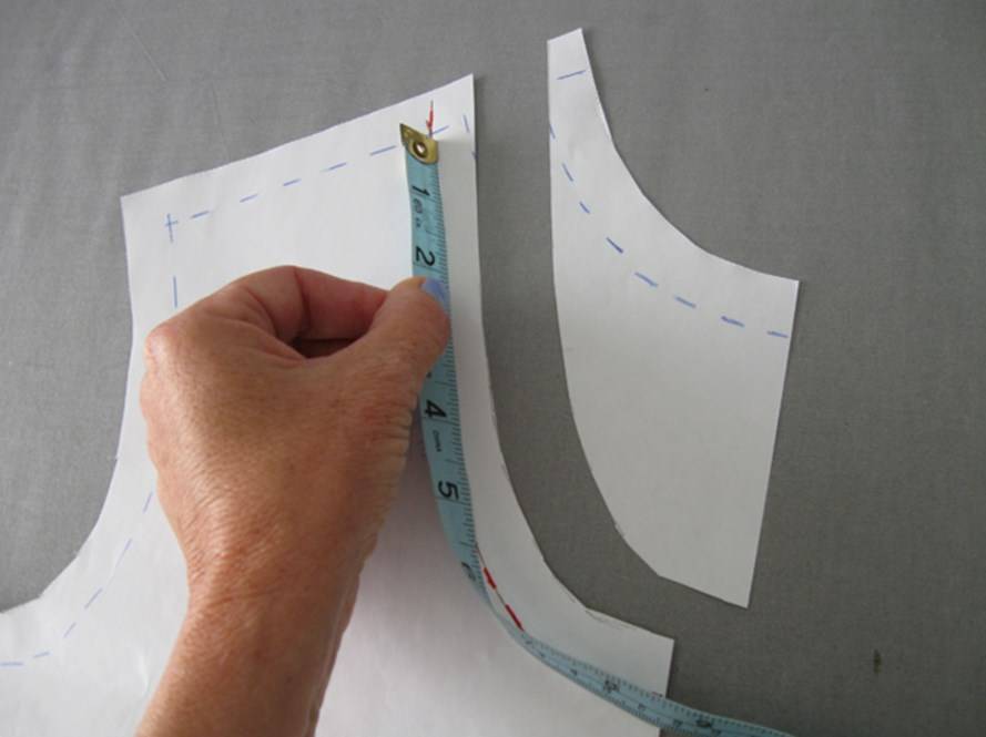 Как правило, для хомута используют удлинённую вниз форму горловины. Измеряем по сшитому изделию или по выкройке длину среза горловины с помощью ленты-сантиметра.