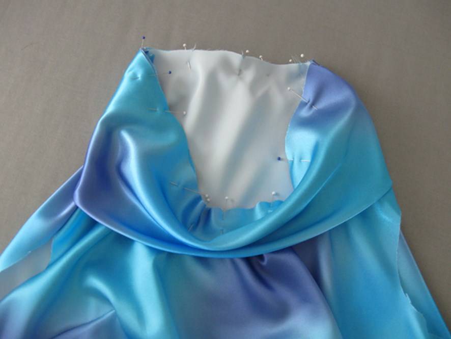 Примётываем хомут к горловине, соединяя центр деталей по полочке, шов воротничка с центром спинки. Выполняем примерку изделия.