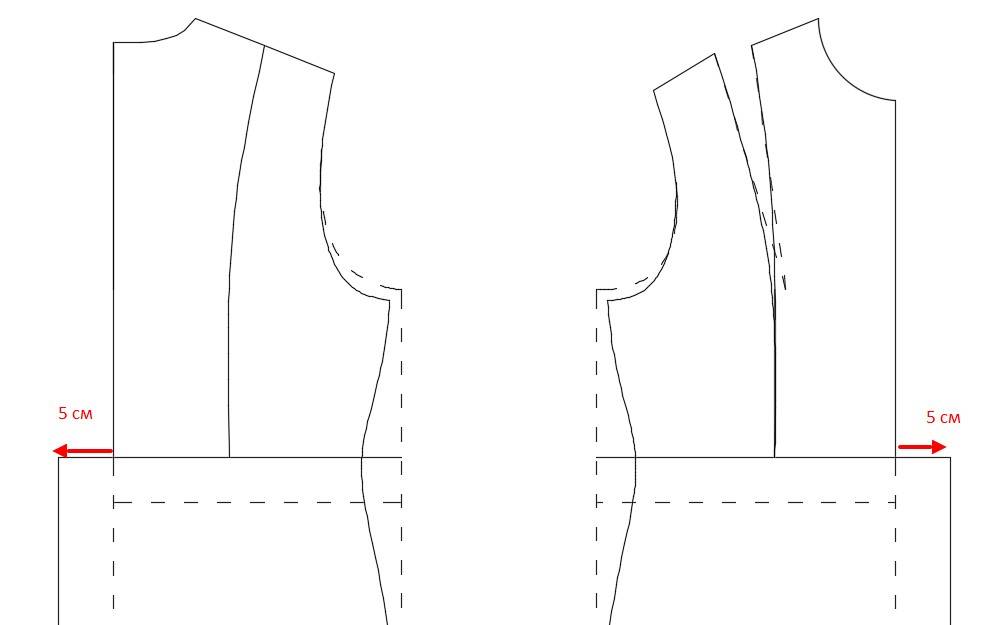 Укорачиваем лекала спинки и переда до нужной длины, выполнив расширение книзу. При этом предварительно определяемся с длиной волана.