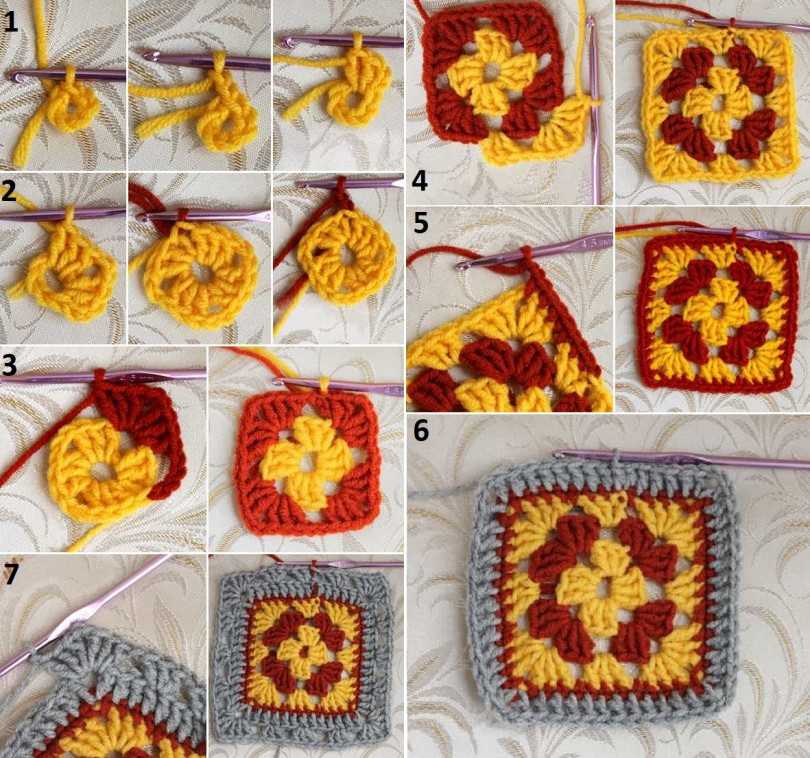 Выше на фото показан метод провязывания соединительных столбиков. Он необходим для правильного формирования классического бабушкиного квадрата. Этот момент также важен, как и прикрепление нити другого цвета, о котором мы расскажем далее.