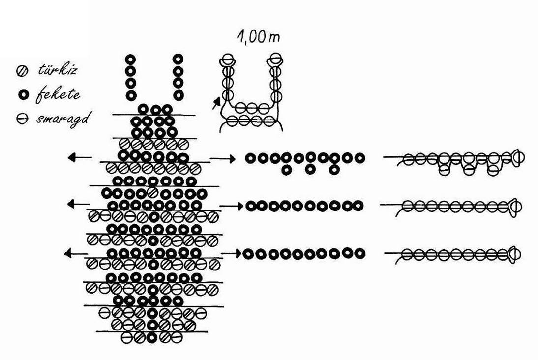 Чтобы сделать петлю, которая показана на схеме, надо после последнего ряда набрать на один конец проволоки 14-17 бисерин (количество и цвета — по желанию), а другой конец протянуть через все набранные бисеринки навстречу первому.