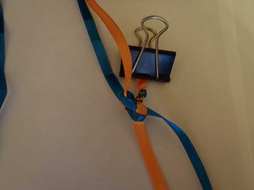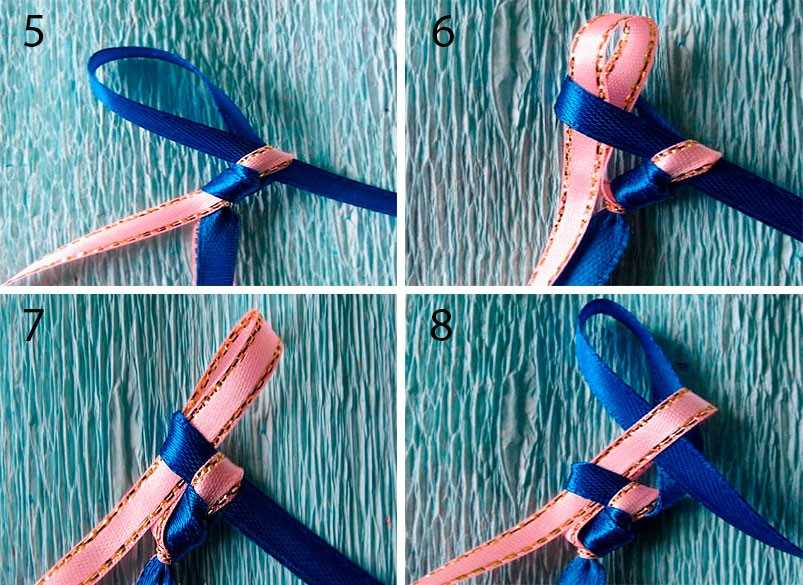 - Повторяем маневр, складывая ленту в петлю, затем протягивая одну в другую. Если части разных цветов, чередуем продевание, затягивание, чтобы плетение было двухцветным.