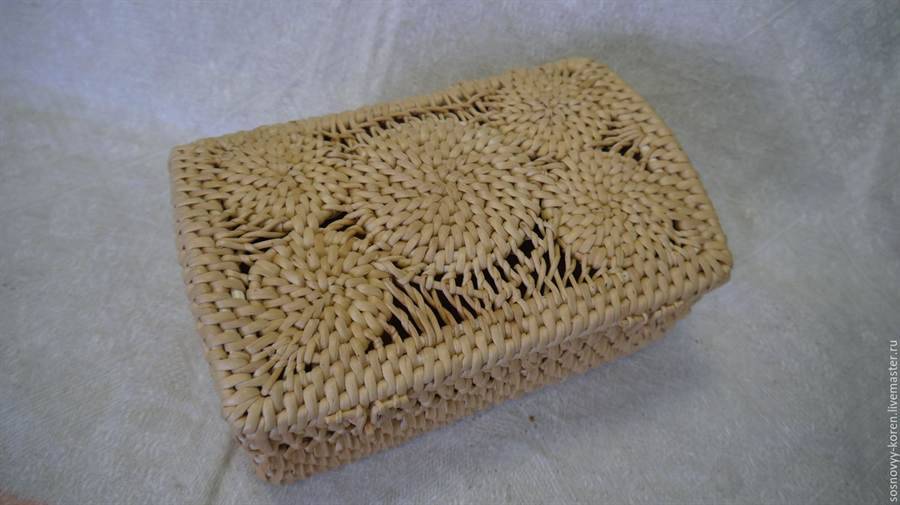 Сосновый корень отличается долговечностью, из него делают изделия различного бытового назначения: корзины, хлебницы, шкатулки, короба, конфетницы, вазы, подносы и многое другое. Изделия отличает строгость форм и натуральный благородный цвет. Даже темнея с годами изделия только выигрывают. По времени изготовления на небольшую солонку требуется 2 дня, если плести не спеша и из уже подготовленного материала. На крупный короб уйдет 3-4 месяца.