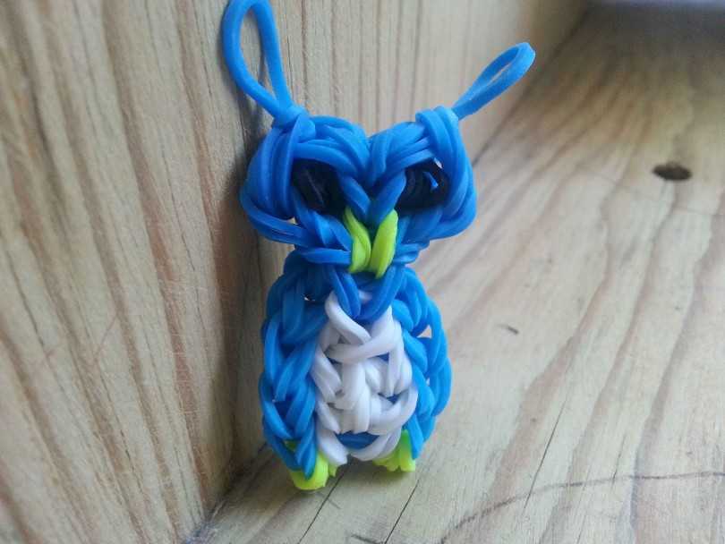 Сейчас популярны 3д-фигурки из резинок. Очень часто вяжется сова — это символ мудрости, таким талисманом хочет обзавестись практически каждый человек. Существует несколько техник, как сплести сову из резинок. Изделие может быть как маленького, так большого размера. Можно сплести объемную или плоскую фигуру. Или изготавливают фрески из резинок с изображением птицы. При плетении используют крючок или станок. Пользуются теми инструментами для изготовления поделки, которые наиболее удобны. Вариант плетения совы при помощи крючка:
