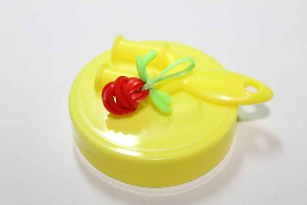 - Последней резиночкой делаем узелок. Приступаем к изготовлению верхней части нашего кулича. Чтобы сделать так называемую глазурь, берем резинки белого цвета, для изготовления конфетти – используем разноцветные. Итак, для начала нужно набрать колечко из шести петелек. В этом ряду будем увеличивать до двенадцати, но плести будем поочередно: одна резинка белая, вторая белая с накрученной цветной.