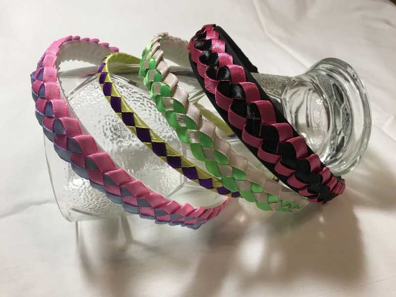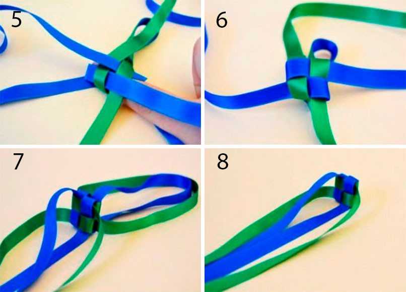 - Повторяют действия. Если же в аксессуар вплетается несколько лент разного цвета, то затягивание петелек чередуют. Сначала затягивают ленту одного цвета, а затем другого.