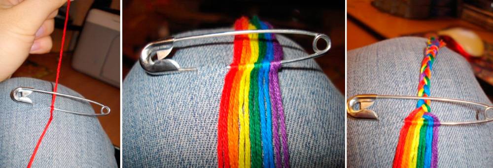 - Далее нужно зафиксировать булавку на подушке с помощью иголки. Разложите нити поочередно или в нужной вам последовательности, согласно схеме.