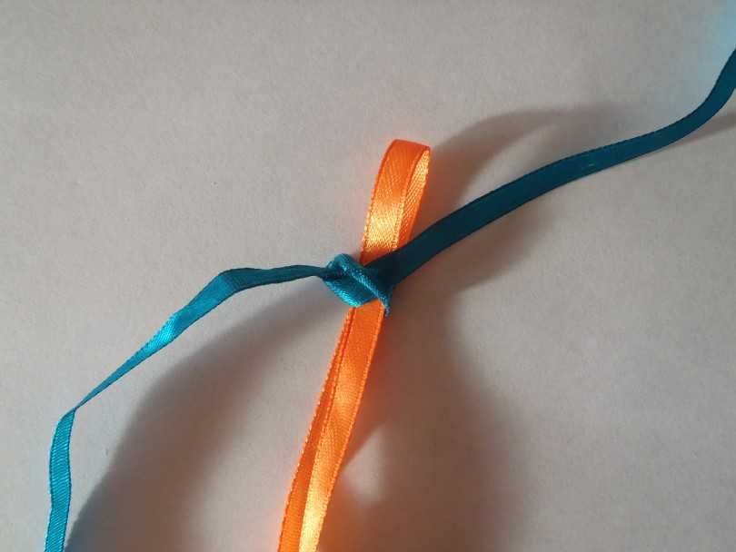 Первоначально нужно связать ленточки между собой, причем узелок должен находиться на кончиках этих ленточек.