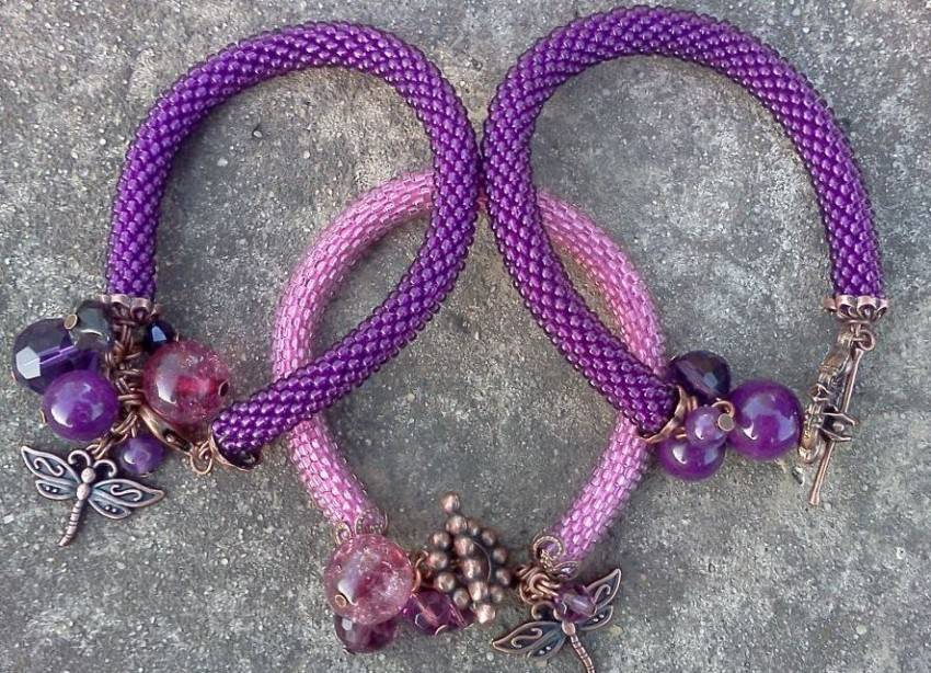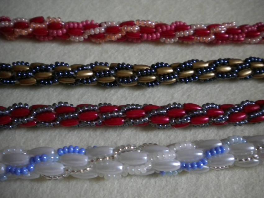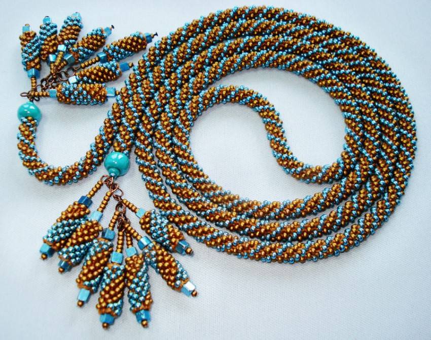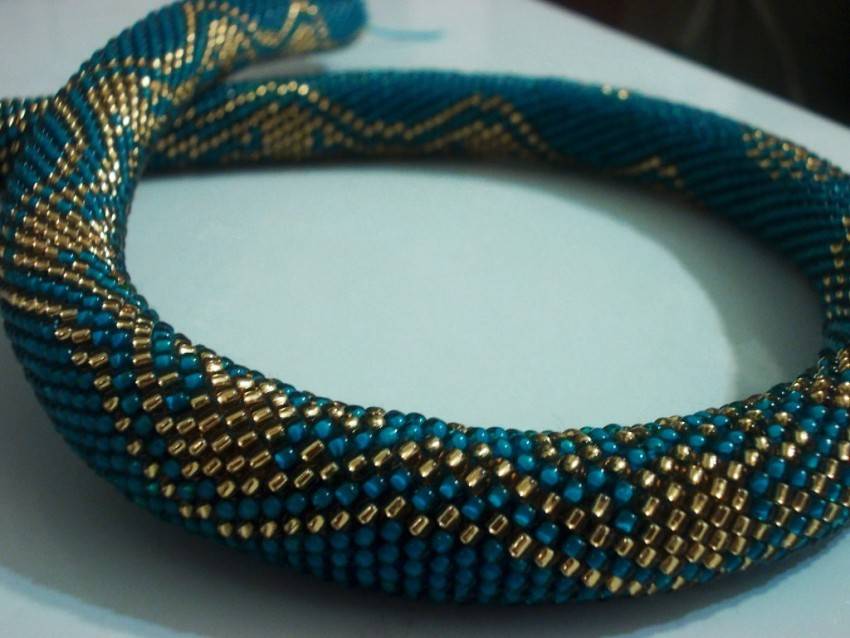 При плетении жгутов используется та же мозаичная техника. Единственное различие – первый ряд бисерин замыкается в кольцо. Толстые жгуты используются самостоятельно, тонкие – сплетаются в эффектные косы.