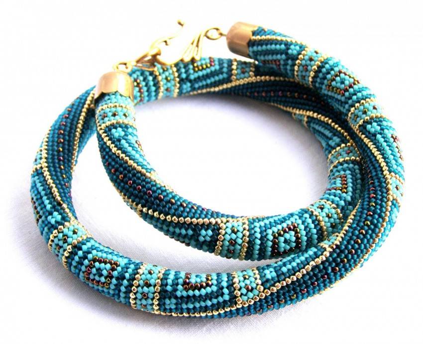 - Узоры на лариате зависят от выбранных схем. Можете использовать программу, в которой есть функция «диктовалки», чтобы мастерица не сбивалась со схемы. На одном лариате могут быть разные узоры.