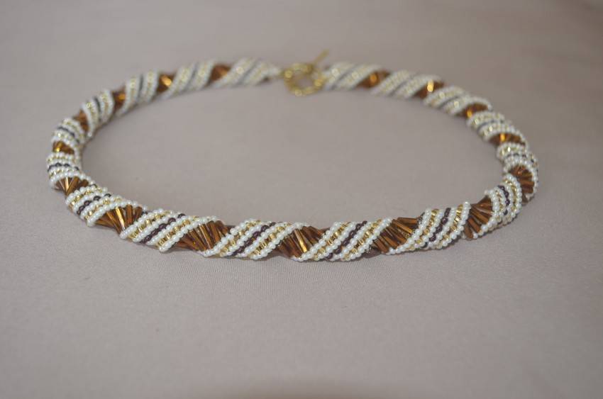 Эффектно выглядит спиральный шнур из бисера, освоить который поможет схема плетения. Для работы используется бисер и стеклярус контрастных оттенков. Алгоритм плетения: