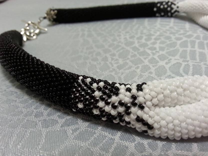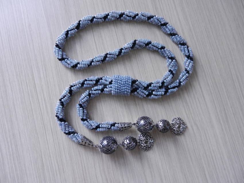 Двухцветный лариат – красивое, эффектное изделие, которое подойдет не к одному модному луку. К слову, лариатом (если вы не знаете) называется длинный тонкий жгут, который можно носить в нескольких вариациях завязывания. Получается, что делая одно украшение, вы получаете многофункциональное изделие, меняющее свой облик.