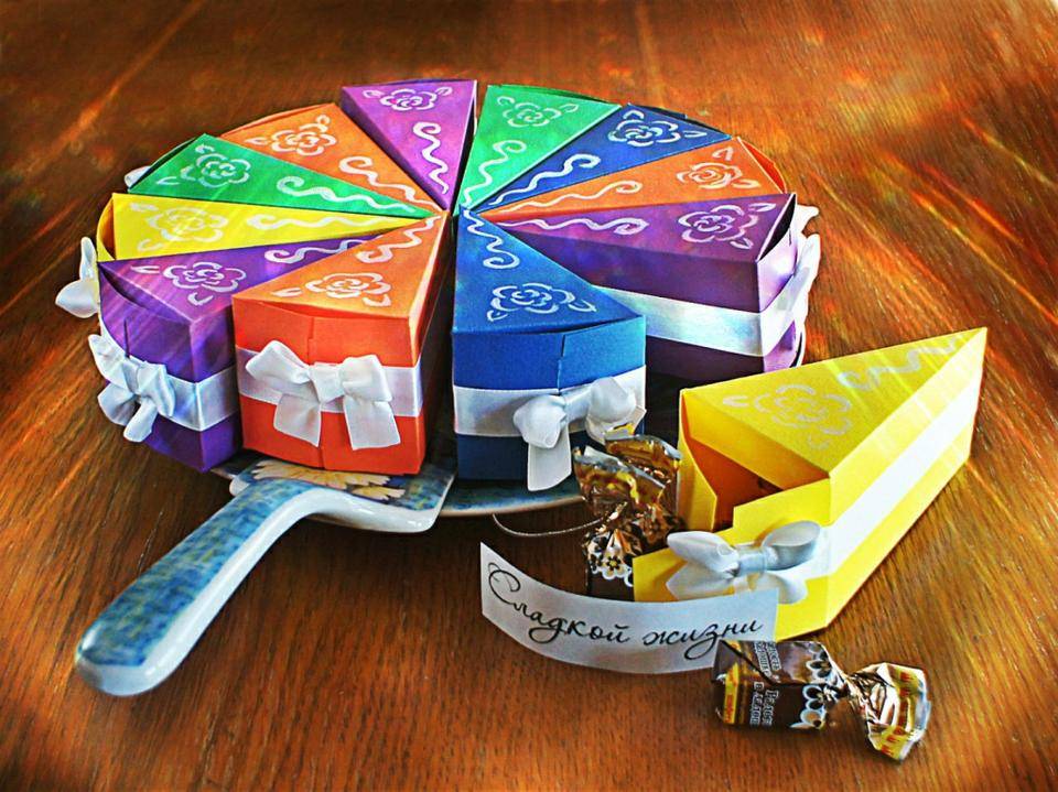 Самодельным тортом из бумаги или картона вы удивите коллег! Украшением для него может служить абсолютно все: цветная бумага, кружева, бисер, кофейные зерна, бантики и пр. Внутри каждого кусочка — конфеты и пожелания.