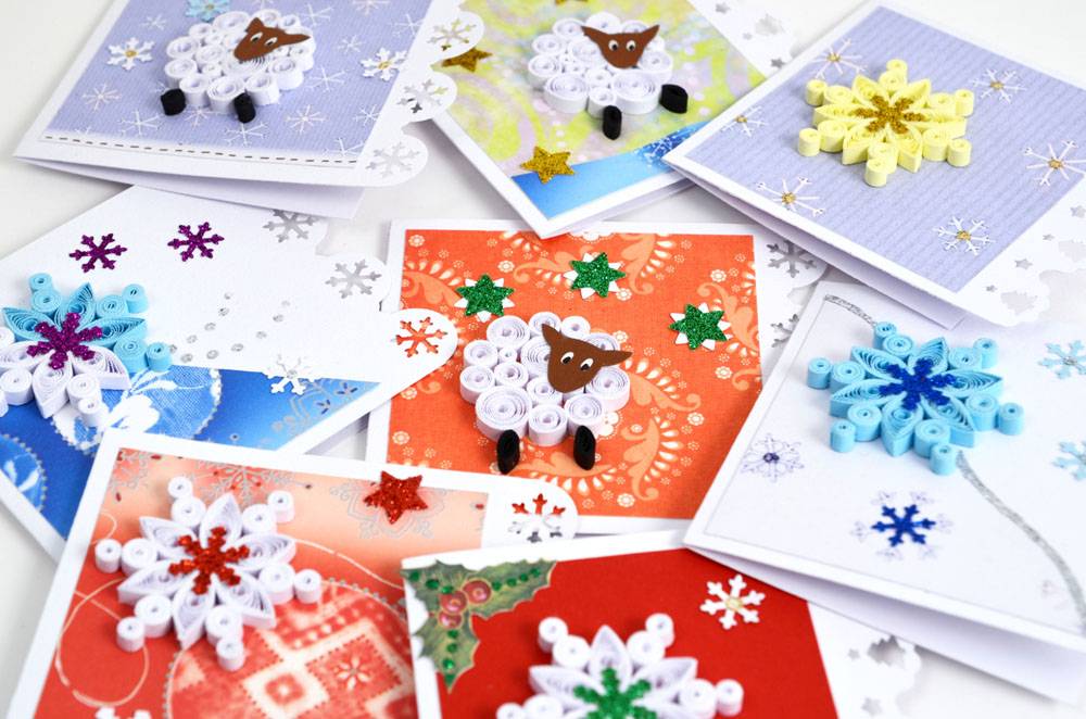В подарок маме на Новый год своими руками можно изготовить открытку с использованием праздничных символов: новогодняя елка, серпантин, елочные игрушки, снежинки или снеговик. На фото новогодние открытки с использованием различных техник изготовления:
